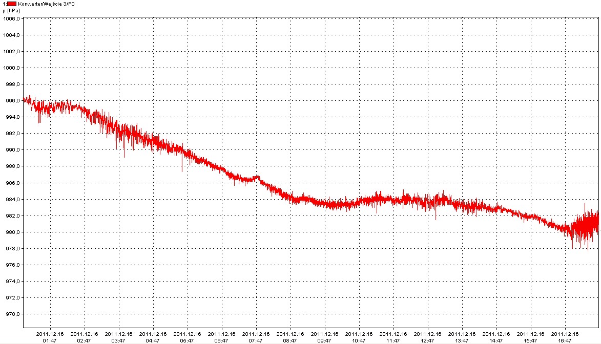 | 2011/12/16 - With wind gusts up to 150km/h, we were having a rather hard period for a few days. Sorry I haven't been updating the blog for a while - hopefully I'll find enough time now to pick the photos for a few posts I should have done days before. For now, have a look at how the air pressure was rapidly changing during those wind gusts. 13hPa spikes! | ||||||||||||||||||||||||